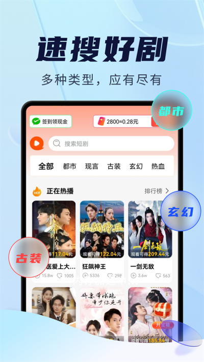 免费短剧太金app下载红包是一款专注于短剧内容的聚合类应用,以海量优质短剧资源为核心,通过智能推荐与简洁操作,为用户提供轻松便捷的短剧观看体验,满足不同题材偏好的观影需求。