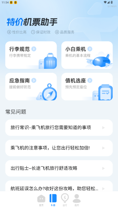 3、全流程乘机指南:涵盖小白乘机、值机流程、行李规范及应急处理等科普内容,助力用户轻松应对出行场景。