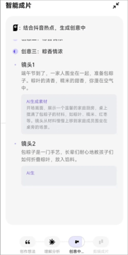 选择“智能成片”,在对话框输入想做的内容,比如“端午节一家人包粽子”