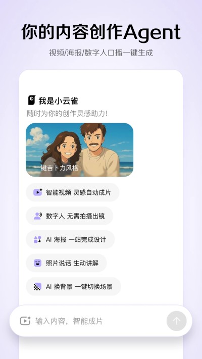 小云雀app是由字节跳动旗下剪映推出的AI视频和图片创作助手,支持AI智能成片、数字人视频、AI设计、AI换背景等多种功能,可为用户提供创作灵感、辅助撰写文案、生成创意内容等服务,帮助用户进行内容创作。小云雀app操作简单,即使是新手小白也能快速上手。此外,小云雀app还接入了Deepseek、豆包大模型,用户只需输入一句话或一个想法,即可生成很棒的创作。无论是自媒体创作者还是普通用户,都能轻松使用,开启属于自己的创意之旅。
