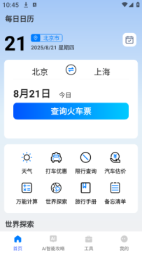 2、进入首页可以看到丰富的功能,输入时间地点即可查询火车票。