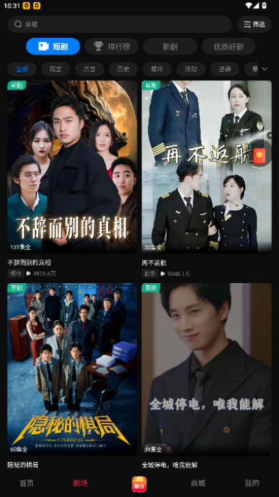3、剧场有很多的短剧资源类型,现言、古言以及历史等。