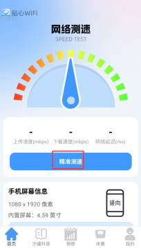 1、打开APP后,在首页点击"网络测速"功能,可实时检测当前WiFi的上传/下载速度及网络延迟情况。