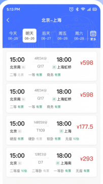 车票查询:用户只需输入起始站和目的地,系统将展示全面的火车时刻表,提供全天候的车次信息,包括坐席等级,对应的价格,是否有票等。