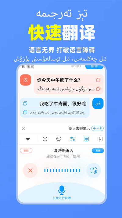 搭载行业领先的语音识别技术,支持维语、汉语双语种实时转写,无论身处嘈杂集市还是安静室内,均能快速精准地将语音转化为文字,大幅提升输入效率,让交流更自然流畅。