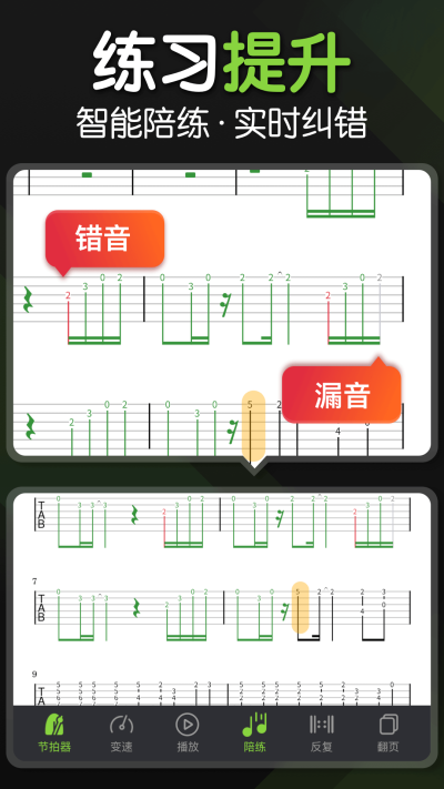 丰富的弹唱吉他谱与智能六线谱,结合AI陪练功能,实时纠错,让练习更加高效。