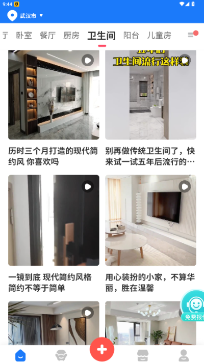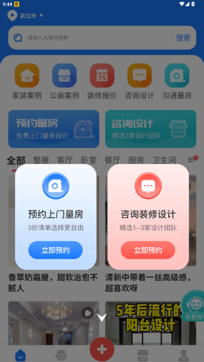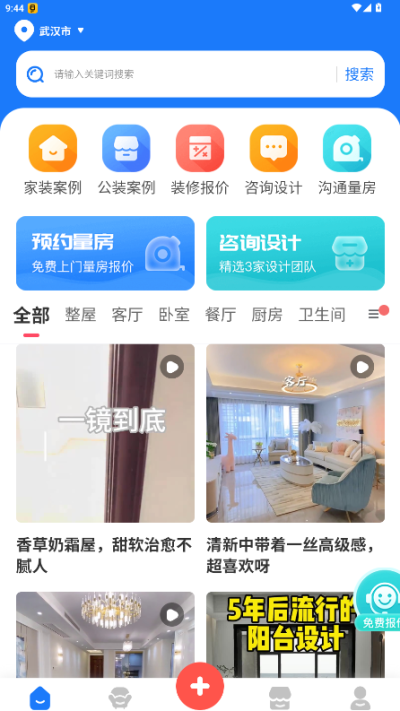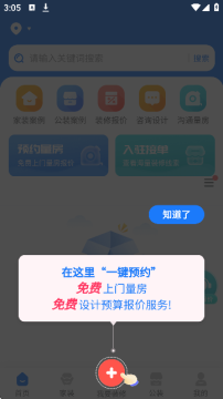 5、然后点击菜单导航栏中的【+】可以“一键预约”免费上门量房,免费设计预算报价服务!