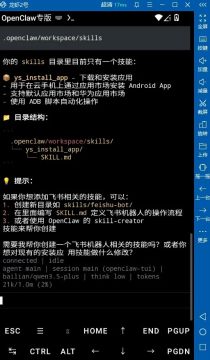 添加自定义的自动化技能,可以前往 .openclaw/workspace/skills 目录。我们在那里为你准备了一个名为 ys_install_app 的示例技能,你可以参考它的格式,轻松编写出符合自己业务需求的自动化脚本。