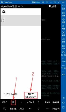3、开启新的工作区,点击 Termux 屏幕左上角的三横线菜单按钮(或从屏幕最左侧向右滑动拉出侧边栏),点击 New Session,可以打开第二个独立的终端窗口。