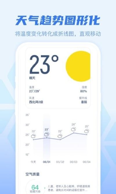 早知天气是款以极简设计×精准预报×人文关怀为核心的天气助手,用科学数据与人性化交互,帮你预判未来15天的天气脉络、读懂空气质量背后的健康信号、一键语音获取当日实况,甚至远程守护家人的冷暖晴雨。界面清爽无广告,是款非常好用的天气预知平台,欢迎下载!