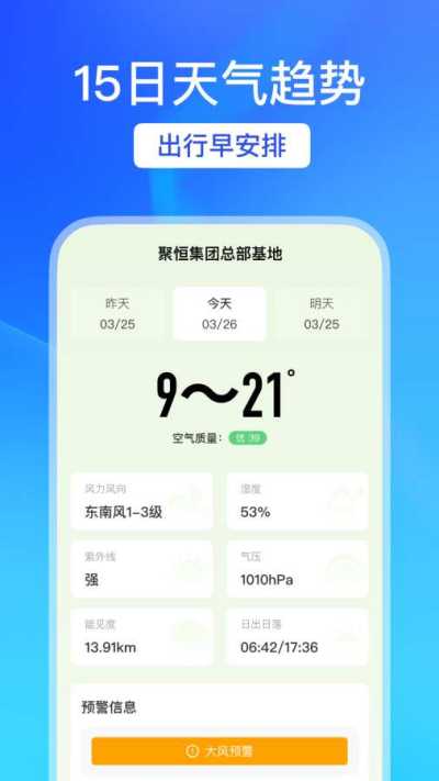 15日天气:包含近15日天气情况展示、天气预警功能,当出现恶劣天气或气象灾害时,应用会及时发布天气预警信息,提醒用户注意安全。