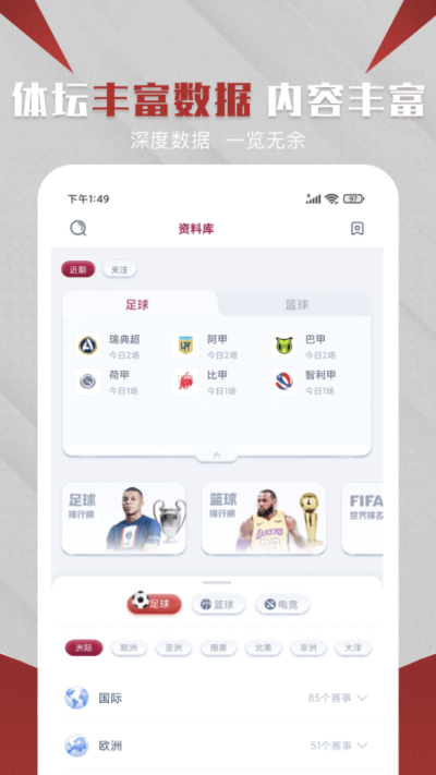 涵盖 CBA(中国男篮职业联赛)、英超、西甲、德甲、意甲、法甲(欧洲五大联赛);