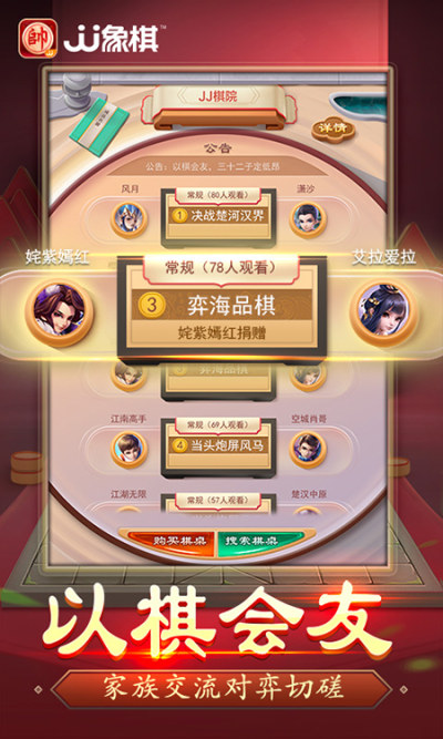 JJ象棋官方正版是一款经典象棋题材的象棋对战游戏,游戏提供了多种不同的象棋玩法,可以让玩家可以与全国各地的象棋高手同台竞技,内置了棋力评测系统,玩家可以通过评测获得称号与段位,与水平相近的对手进行竞技,还设有旁观模式,玩家可以实时观看其他玩家对弈,学习他们的棋艺和策略!