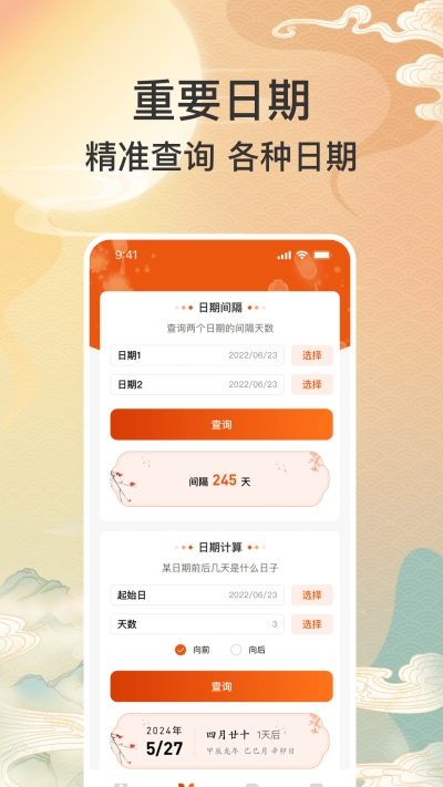 1、多类日历精准查询:支持农历、公历、黄历等多种日历信息的精准查询,所有信息经过严格校对,确保真实准确,让用户全面了解各类日期相关的宜忌、节气等内容。