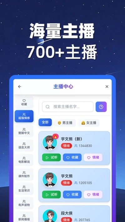 700+专业配音员可选,涵盖男女声、童声、老年声,部分主播支持开心、愤怒、悲伤等情绪切换,精准传递内容情感。