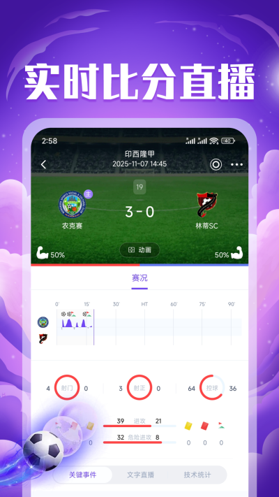比赛进行中?秒级同步比分、进球、红黄牌、换人、控球率等关键数据;