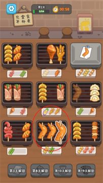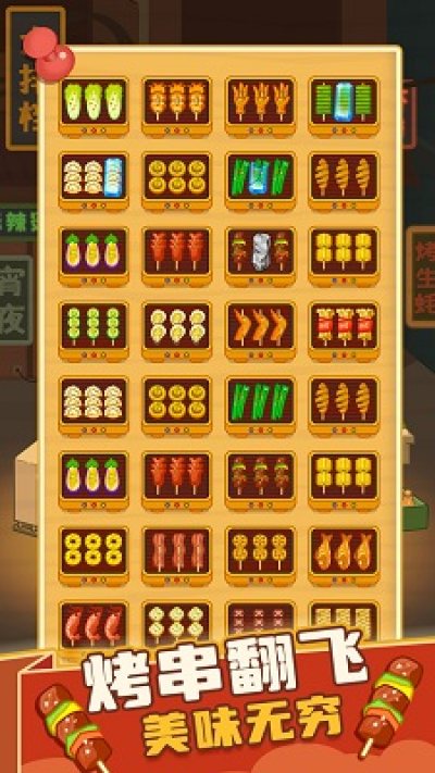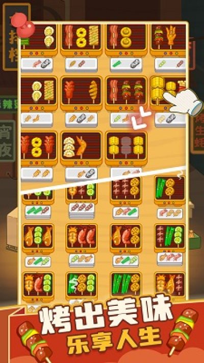 1、玩家扮演烧烤摊大掌柜,通过指尖轻点、拖动烤串,使三根相同的烤串碰在一起触发消除。
