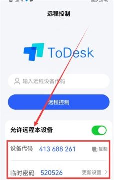 1、在自己的手机和另一部手机上安装ToDesk,打开被控制的手机上的ToDesk软件,点击“允许远程本设备”右侧的开关。
