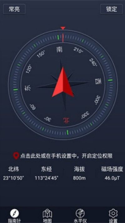 2、进入首页指南针板块,用户可以查看所在位置的经纬度海拔等信息。