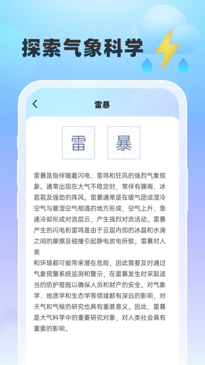 -天气概念科普:引入天气常识科普模块,通过趣味互动教学法,使您在日常生活中便可了解的气象知识。伴随着科普知识或有趣的天气事实,把复杂的科学概念变成轻松愉快的学习体验。让用户在日常生活中自然而然地提升气象智慧。