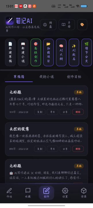 笔记AI 是一款基于大语言模型的 AI 创作工坊,集成作品生成、收藏管理、手动写作、AI辅助、数据管理于一体。以下是所有功能的详细清单,按使用场景分类。