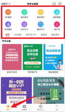 2、进入首页可查看VIP课程、预约练车、理论学习等模块,点击图标即可进入对应功能。