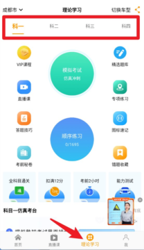 4、点击“理论学习”标签页可进行顺序练习、模拟考试、答题技巧等理论学习操作。