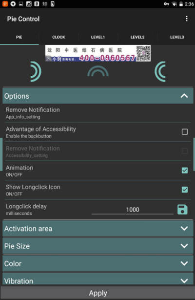 在 Pie Control 的设置页面上你还可以对齐进行更多的设置,譬如手势的区域、扇形盘的大小、颜色、透明度等等。如果付费升级到专业版的话,还可以增加应用显示的层数和个数,以及添加一个应用列表显示框。这款应用确实能够让你在大屏下更有效率地工作,是否升级到专业版就看个人需求了。