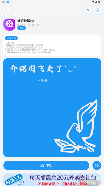 白鸽软件盒子最新版2026官方版是一款专注于应用资源下载的工具类软件,支持关键词模糊搜索,用户输入关键字即可快速识别并获取匹配度最高的资源,同时涵盖免费小说、漫画等内容,满足用户多样化下载需求。
