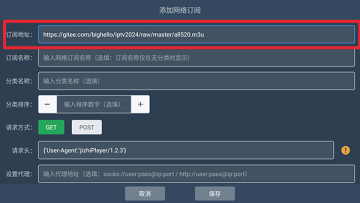 4、把上面的直播源复制在订阅地址那一栏,然后点击保存。