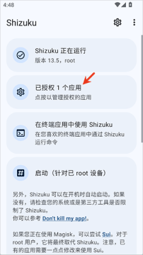 1、使用Shizuku进行授权,让更多高级功能的Xposed模块能够运行,Shizuku的激活可以参考本站Shizuku的下载页或其官网