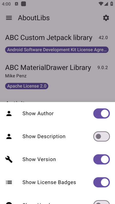 一个库,为您提供所有你需要的图书馆的信息!大多数现代Apps功能的“二手库”-section,为此需要这些库的一些信息。因为它很烦人,始终复制这些字符串到你的应用程序,我已经开发了这个小助手库,以提供所需的信息。这是该库的示例应用程序。你可以找到所有的细节,如何使用,... GitHub的网页上!