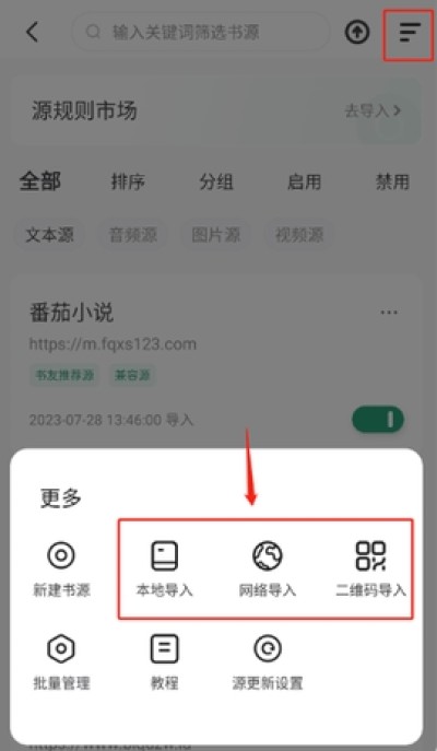 2、在源规则市场界面中点击一键导入,或者自选书源导入
