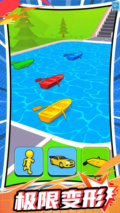 在游戏内,你将会化身各式各样的交通工具,进行速度竞赛,操作方式简单,只需在对应路段前,选择下方你认为可以快速通过该障碍路段的工具,即可马上变形,顺利通过!游戏内根据不同路段为你提供了多种多样的变形工具,可以通过独木桥的自行车,能徜徉游泳池的水上皮艇,还有能够飞跃悬崖峭壁的滑翔伞,多种工具,为你提供多样的游戏体验!同时,在竞速关卡中取得胜利,你还可以获得资金,建造自己的小镇!在小镇中解锁各式商铺,披萨店、冰淇淋店或者健身房,让这些店铺为你带来更多金币收益!