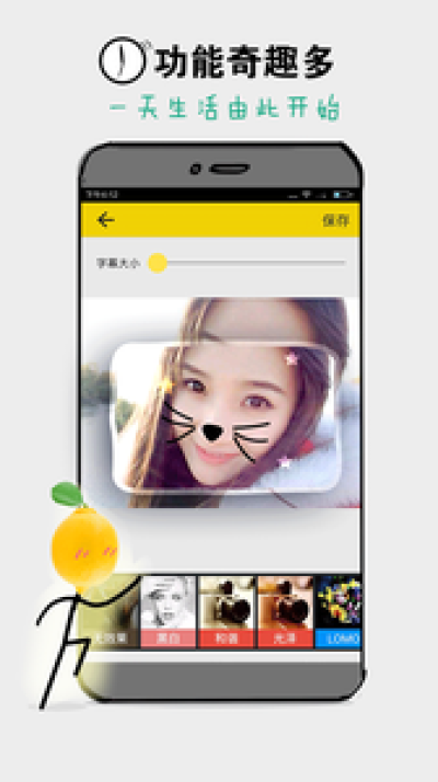 图片效果—你能通过拍照功能轻松拍出具有电影大片感的图片,用电影与字幕的方式记录生活。随时调整字体大小与效果。