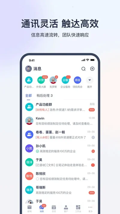 3、亮点突出,能一目了然获取已读未读信息,添加快捷联系人。特色是轻松移动办公,追踪业务信息,团队数据同步更新。