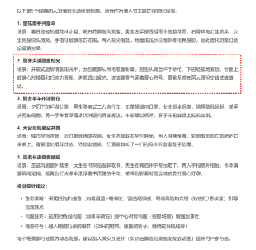 我是一个电商设计师,需要设计一幅情人节主题的运营海报,画面要以一对情侣为主,展示出温馨浪漫的氛围,请你帮我想5个不同的情侣互动场景,要经典、动人、有吸引力。