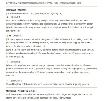 不过这种带权重符号的提示词并不适合 F.1 模型,所以可以让deepseek用自然语言重新生成一次。可以看到它对画面的描述非常详细,要求的细节全都有,这可比自己想要全面、快速多了。
