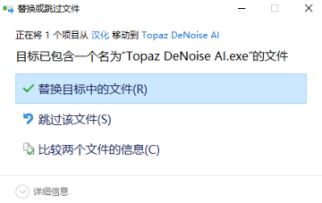 4、将汉化文件夹里面的Topaz DeNoise AI.exe复制到安装目录替换。默认安装目录替换:C:\Program Files\Topaz Labs LLC\Topaz DeNoise AI;