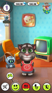 1、进入游戏,界面下方有游戏、吃饭、厕所、睡觉供玩家们选择,要让汤姆猫达到100%可以让他拥有好心情;