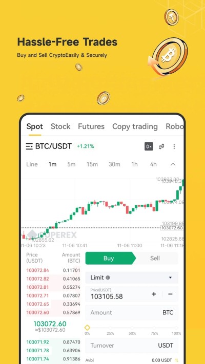 现货交易:选择币种对,输入数量与价格,确认后即时成交。