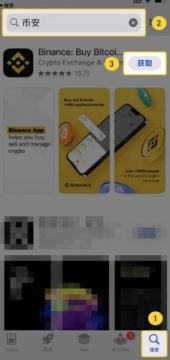 2.登录成功>>点击"搜索">>输入"币安">>点击"获取"。
