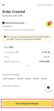 付款流程完成后,选择已付款,通知卖方。订单状态将变更为放行中。请等待卖方确认您的离线付款。他们将在验证您的付款后放行加密货币。您可以在资金帐户中找到购买的加密货币。
