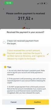 4.收到买方付款通知后,务必确认资金已入账,再点击【已收款】和【确认】。切勿在未收到付款前放币。
