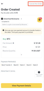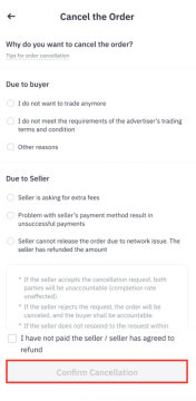 欲在订单成交前取消订单,请点击取消订单。选择取消原因,点击确认取消。请注意,如果您一天取消三笔订单,则将于当天暂时停用您的买币功能。