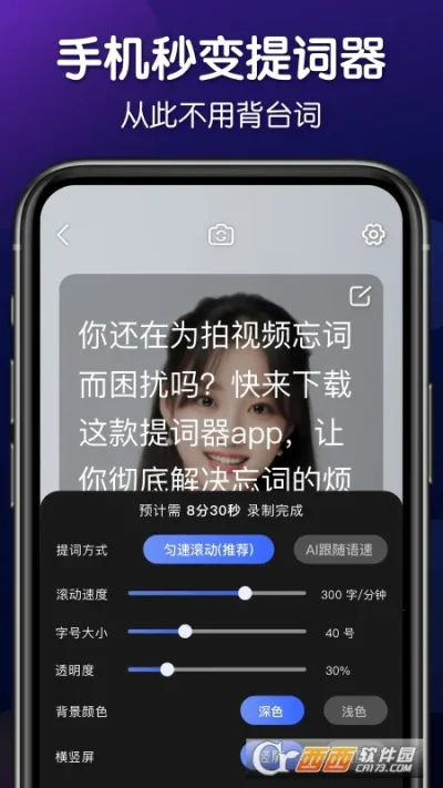 3. 自定义超个性:能自定义提词板的宽窄、字体、颜色、滚动速度、背景透明度等,打造专属体验。