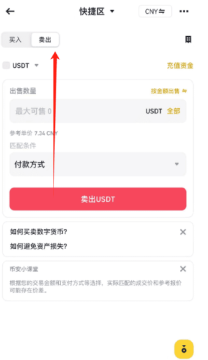 以USDT为例:打开币安APP首页,点击【快捷买币】—【去卖币】—输入【卖出数量】或【金额】—【出售USDT】—【确定】—选择收款方式,【确认出售】