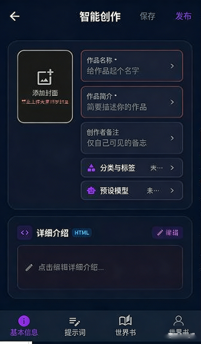3、智能创作便捷,支持自定义作品封面、简介、名称、模型及标签,操作简单,无需专业基础,轻松完成个性化创作。