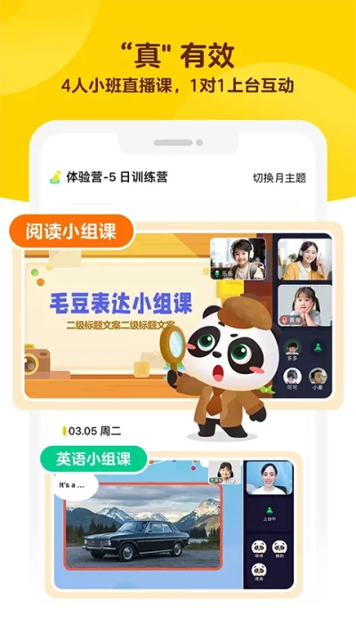 3. 可根据孩子年龄阶段选择主题课程,通过形象生动的图片与视频学习。学习中利用AI直播教学,与老师互动,让孩子轻松爱上阅读,学会表达。