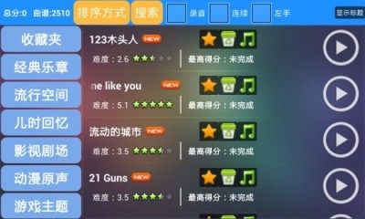 游戏分为五个模式,分别是:新手模式,游戏模式,自由模式,钢琴键盘模式和欣赏模式。